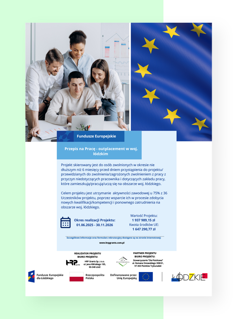 Projekt Przepis na Pracę – outplacement w woj. łódzkim skierowany jest do osób zwolnionych w okresie nie dłuższym niż 6 m-cy przed dniem przystąpienia do projektu/ przewidzianych do zwolnienia/zagrożonych zwolnieniem z pracy z przyczyn niedotyczących pracownika i dotyczący zakładu pracy, które zamieszkują/pracują/uczą się w rozumieniu Kodeksu Cywilnego (KC) na obszarze woj. łódzkiego.